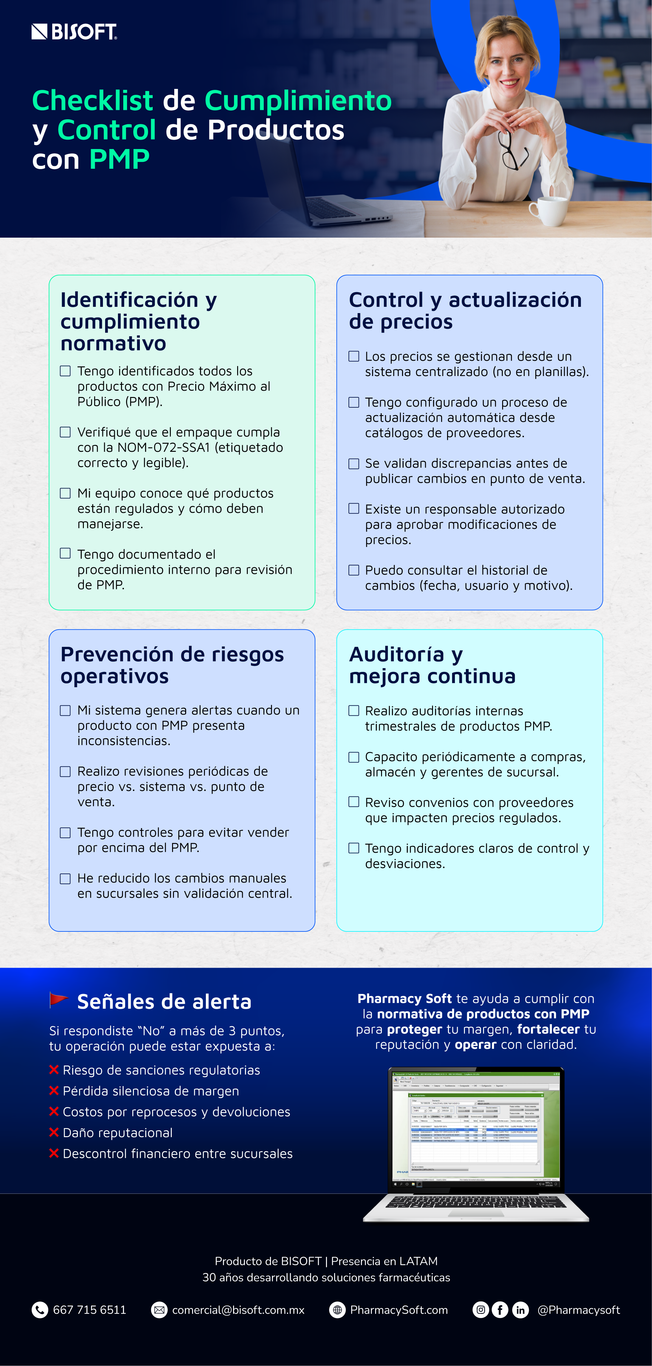 Cuando hablamos de cumplimiento normativo en farmacias, no es solo un asunto legal, es una pieza central de la competitividad. Los productos con Precio Máximo al Público (PMP) requieren especial atención porque un manejo inadecuado no solo genera sanciones, también erosiona márgenes, daña la confianza del cliente y complica la operación diaria.